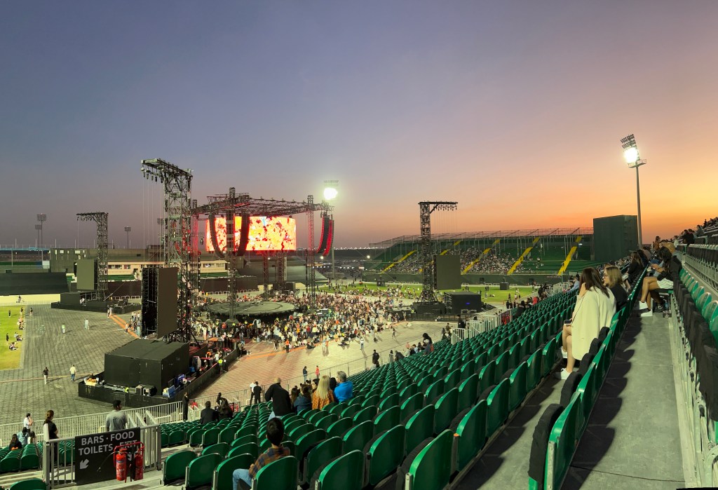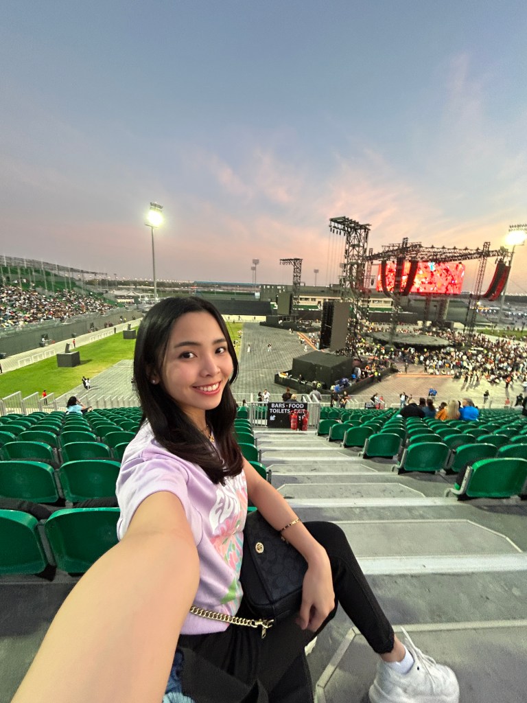 I arrived at the stadium around 4 PM. Entrance and scanning were quick. I immediately went to the food stalls and bought snacks. About 20 minutes later, the queue was already packed. If I hadn’t bought my food, it would have taken me an hour just to queue. Then I went ahead to buy merch – got myself a shirt, bought another shirt for my mom, and a tote bag. I had a reserved seat on top of the bleachers, so I had quite a good view of the 360-stage. I forgot about the temperature drop during winter in the UAE, and the stadium was basically in the middle of the freaking desert – it was giving me the ~ Shivers ~ 😉